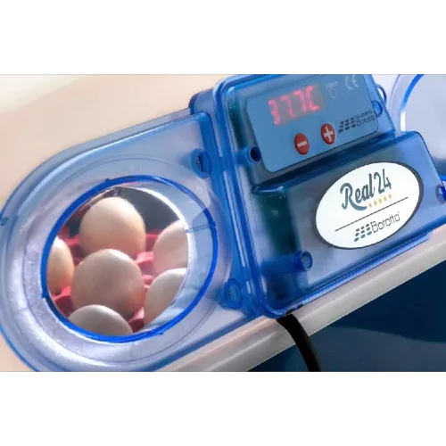 BOROTTO REAL 24 je univerzalni polavtomatski inkubator za jajca, zasnovan za domače in manjše rejce perutnine. Omogoča zanesljivo valjenje različnih vrst jajc z enostavnim upravljanjem in natančnim nadzorom temperature.