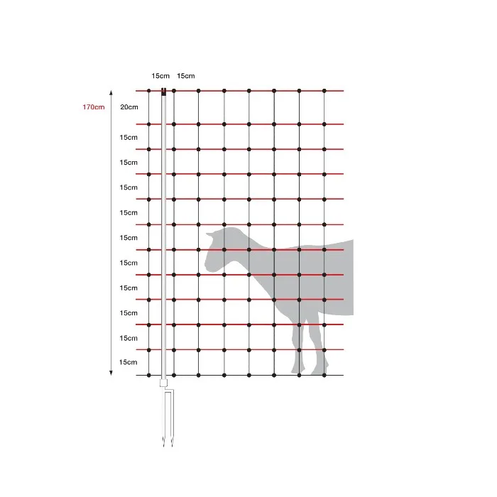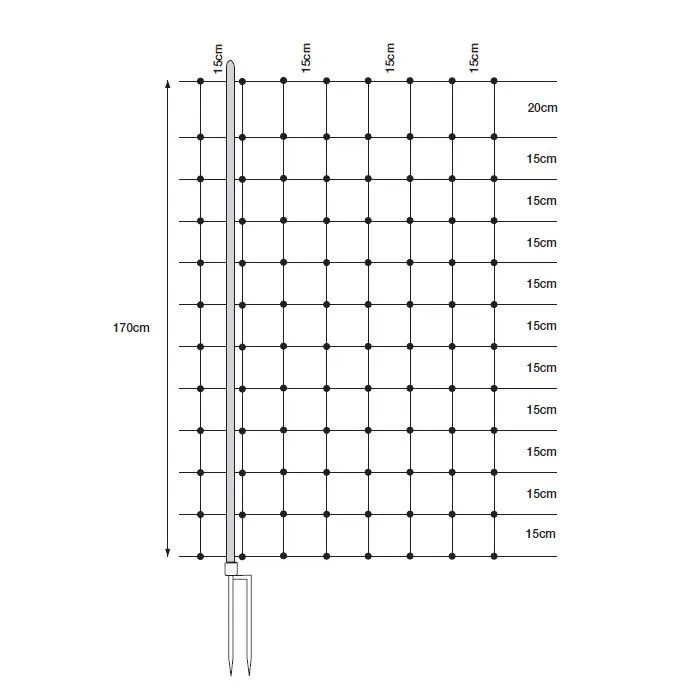 Mreža proti divjadi višine 170 cm z dvanajstimi vodoravnimi plastičnimi žicami, vključno z eno neelektrificirano ozemljitveno žico in enajstimi elektrificiranimi žicami. Druga prevodna žica od zgoraj: 1 x 0,20 bakra in 2 x 0,20 mm nerjaveče jeklo.