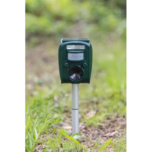 Solarni ultrazvočni odganjalec živali z zaznavanjem gibanja, LED bliskavico in nastavljivimi frekvencami.